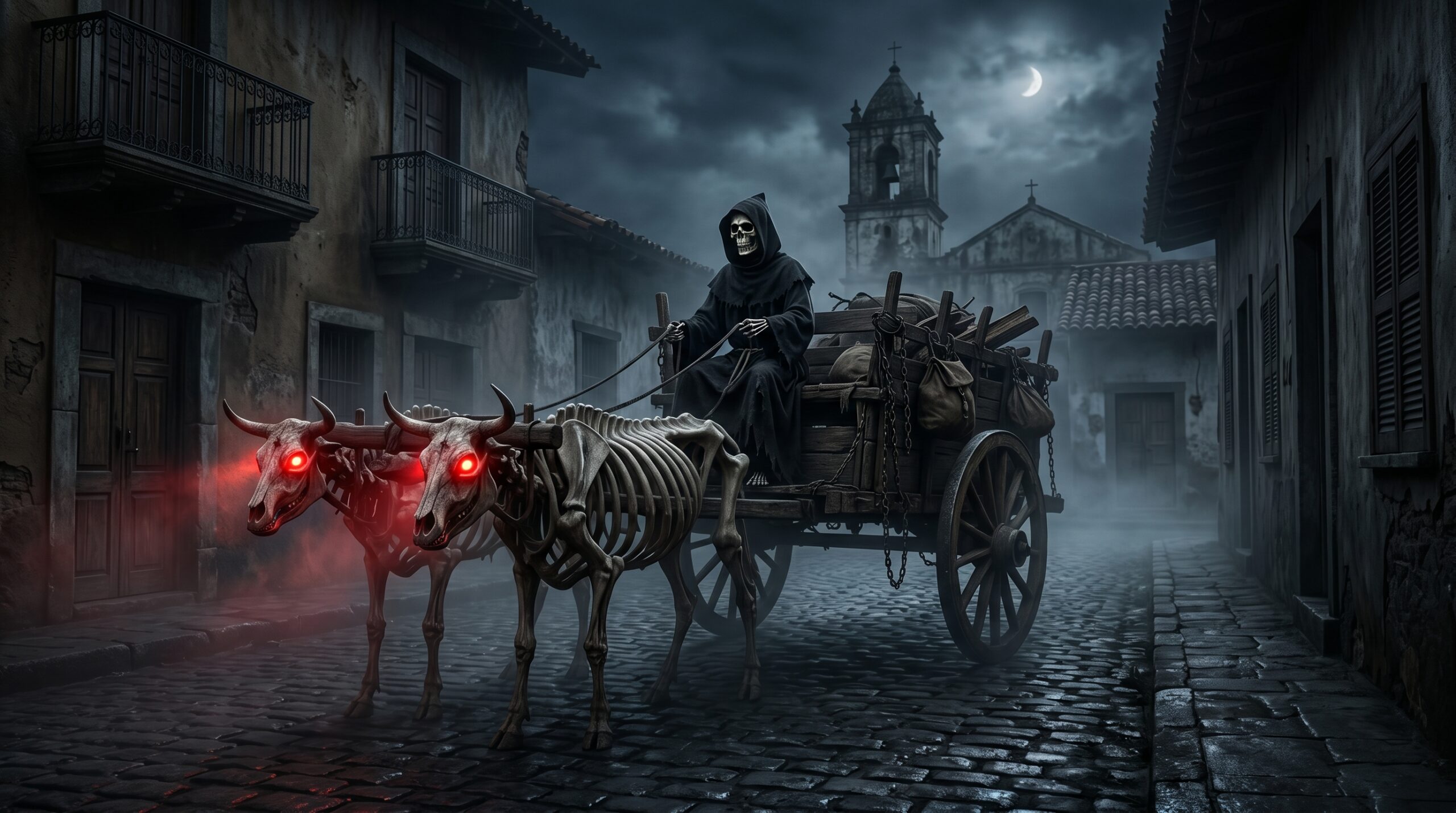 Primero llega el sonido. Después, entre la niebla espesa, aparece la silueta. Una carreta grande, negra, de madera podrida. La tiran dos bueyes esqueléticos, con los huesos brillando bajo la piel reseca y cuencas vacías que arden con un fuego mortecino.